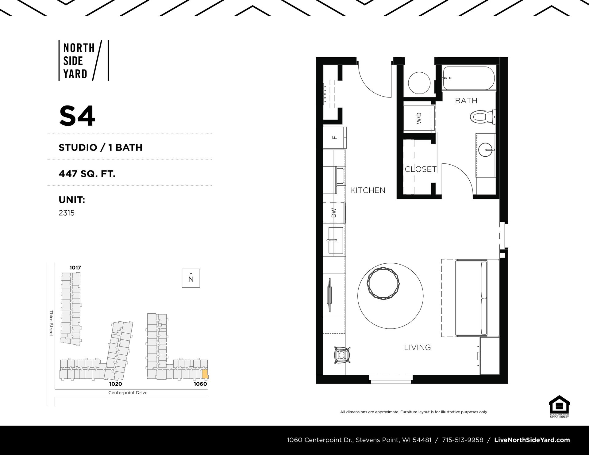 This is a Studio unit located in North Side Yard (NSY), Stevens Point's first residential apartment community located in downtown! NSY features 159 residential units ranging from studios to 2 bedrooms. These secure buildings have ample bike storage and are just steps from the Wisconsin River's riverfront recreation trail. NSY is within walking distance to the public square (where Farmers' Market takes place) and historic Main Street attractions. The community has an onsite fitness center and community room for residents.