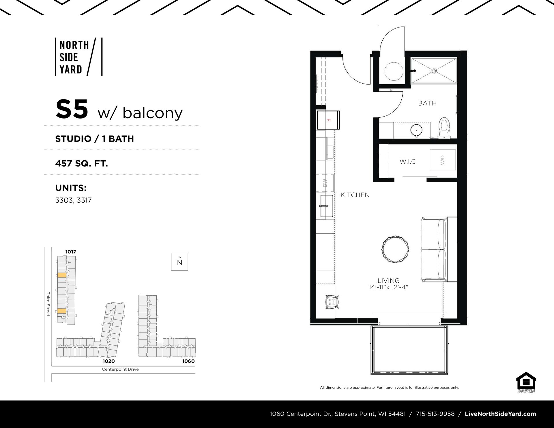 This is a studio unit in North Side Yard, Stevens Point's first residential apartment community located in downtown! North Side Yard features 213 residential units ranging from studios to 2 bedrooms. The secure buildings have ample bike storage and are just steps from the Wisconsin River's riverfront recreation trail. The building is within walking distance to the public square (where Farmers' Market takes place) and historic Main Street attractions. The property has an onsite fitness center and community room for residents. All units are equipped with in-unit washer & dryer, dishwasher, and select units have balconies. Units on the first floor have private walk-up entries. A limited number of our studios also have murphy beds. Ask us about fully furnished units! North Side Yard is a pet-friendly property.