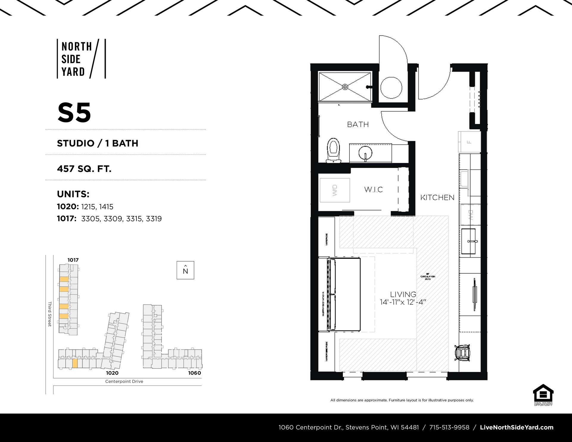 This is a Studio unit located in North Side Yard (NSY), Stevens Point's first residential apartment community located in downtown! NSY features 159 residential units ranging from studios to 2 bedrooms. These secure buildings have ample bike storage and are just steps from the Wisconsin River's riverfront recreation trail. NSY is within walking distance to the public square (where Farmers' Market takes place) and historic Main Street attractions. The community has an onsite fitness center and community room for residents.